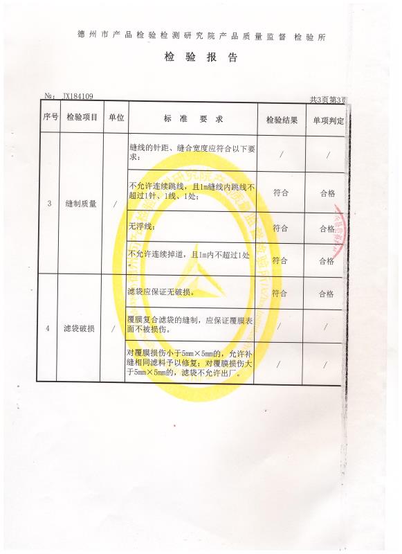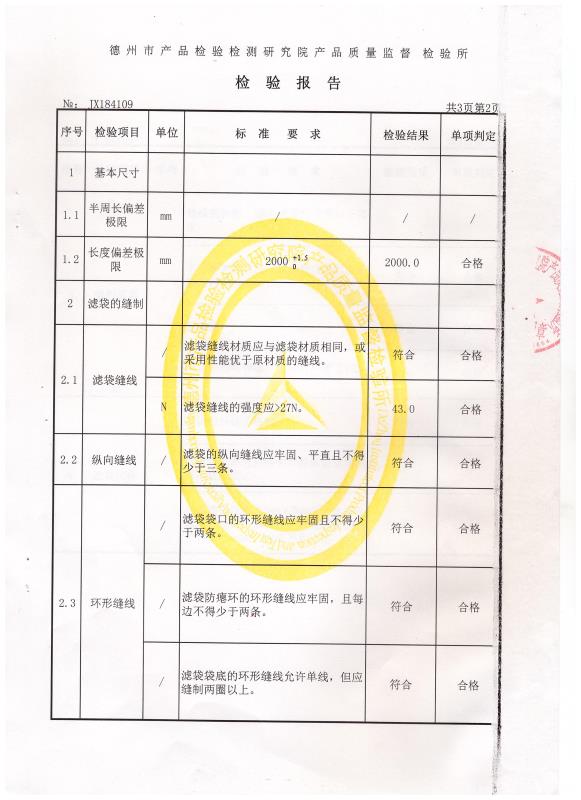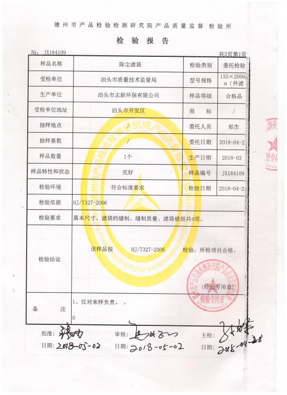 除尘布袋检验报告 发布时间:2018/6/1 13:34:56作者:来源:志新环保点击:字号:大中小 除尘布袋检验报告 送受检单位 泊头市质量技术监督局 产品名称 除尘布袋 生产单位 泊头市志新环保有限公司 样品特性和状态 完好 检验依据 HJ/T327-2006 样品等级 合格品